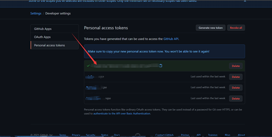 这里就是你刚刚建好的token了复制保存好了,页面一旦关闭就再也看不到了.