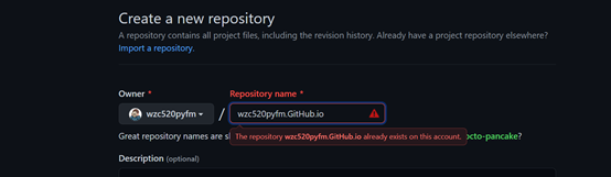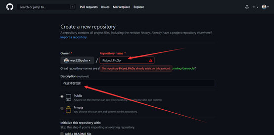 Repository name 是仓库名,你可以按照图中的填写,也可以填其他的.(因为我已经有一个同名的仓库了,所以会提示错误) Description是对这个仓库的描述.