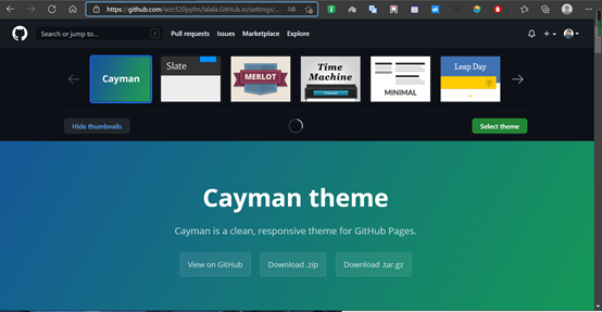 选择完毕后,GitHub Pages就会自动帮你生成好网站,在它跳转到的页面底端点击Commit changes按钮,网站就可以访问了.