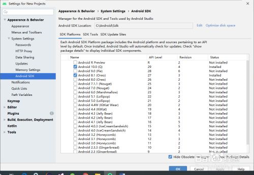 6.4.2 进入如图界面,在表格中找到API Level 是27的选项并勾选,然后点击ok按钮。