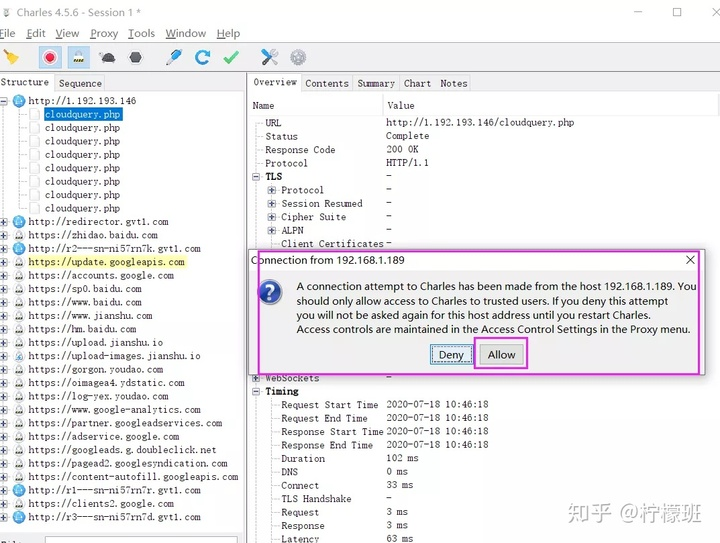 Charles上允许代理连接: 此时,手机配置好代理后,访问任意流量都会经过Charles工具,所以Charles工具会弹出如下图所示的提示信息,选择“Allow”,允许即可。