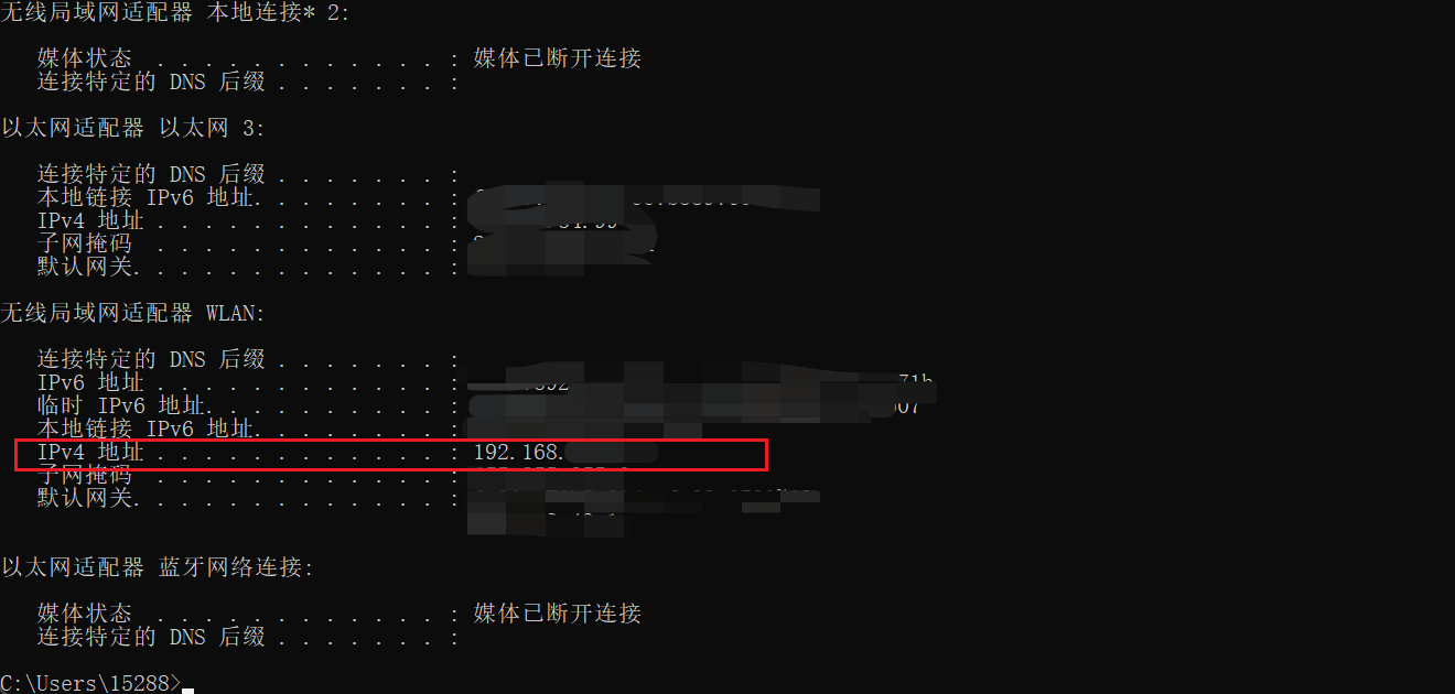 ipconfig, 回车, 找到Ipv4, 如下图