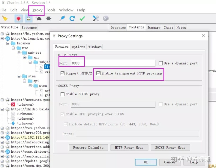 配置charles端口号, 默认8888, 并勾选”Enable transparent HTTP proxying”, 如下图