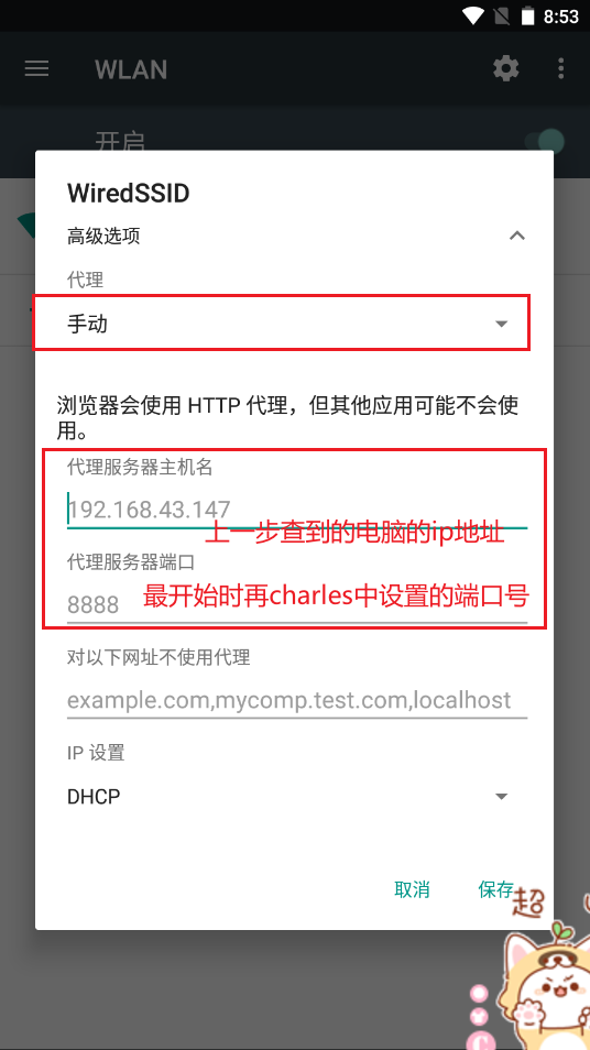 如下图所示:手机代理配置192.168.1.189(我电脑的IP地址),端口为8888(Charles配置的代理端口):